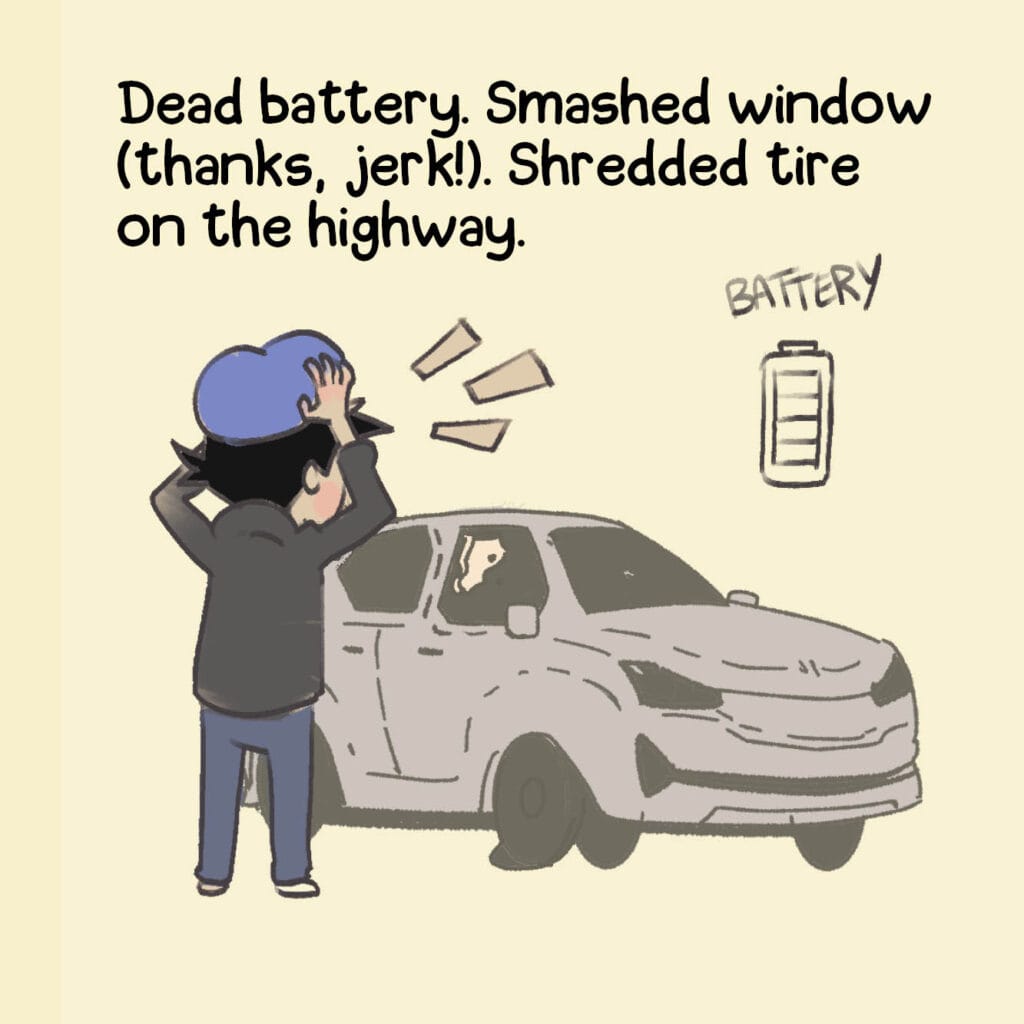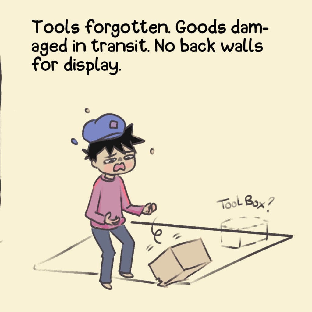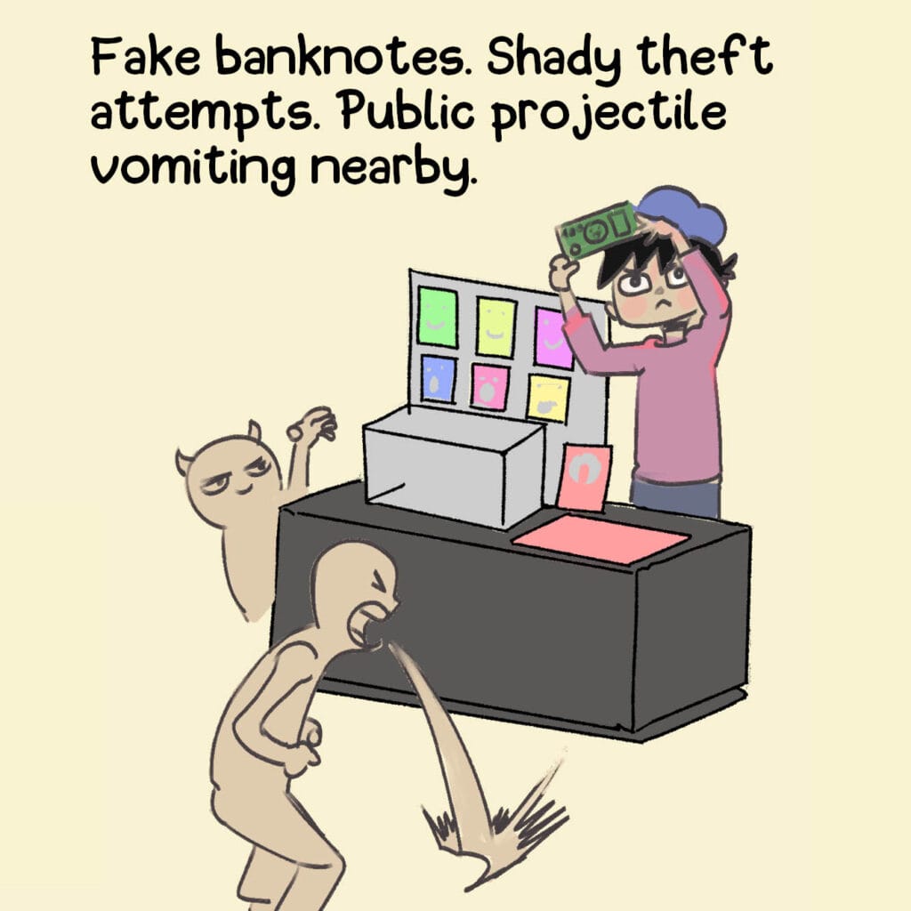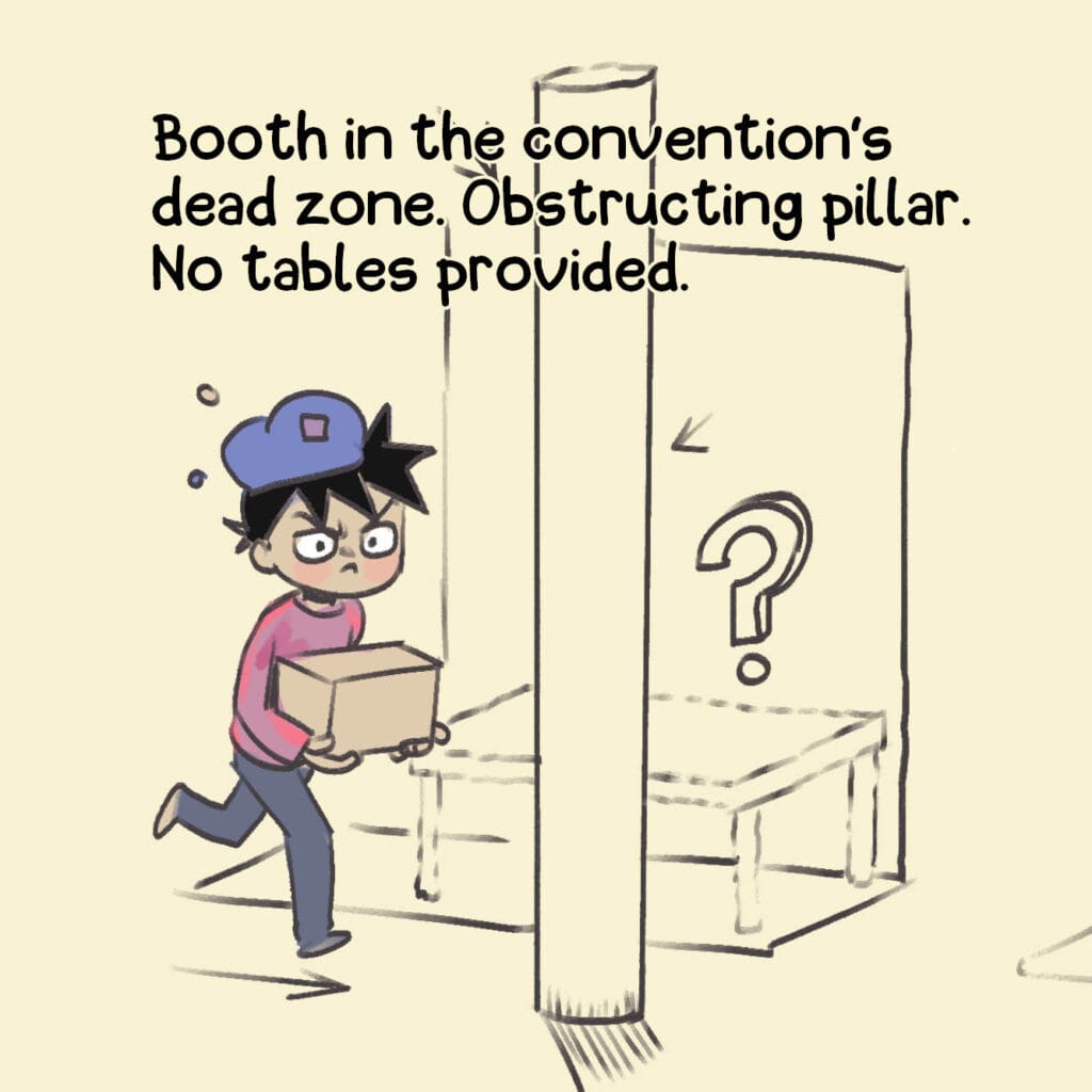 A 4-panel comic about surviving the chaos of artist alleys — from setup to long lines and late-night exhaustion. A humorous look at the trials every artist faces during convention season.