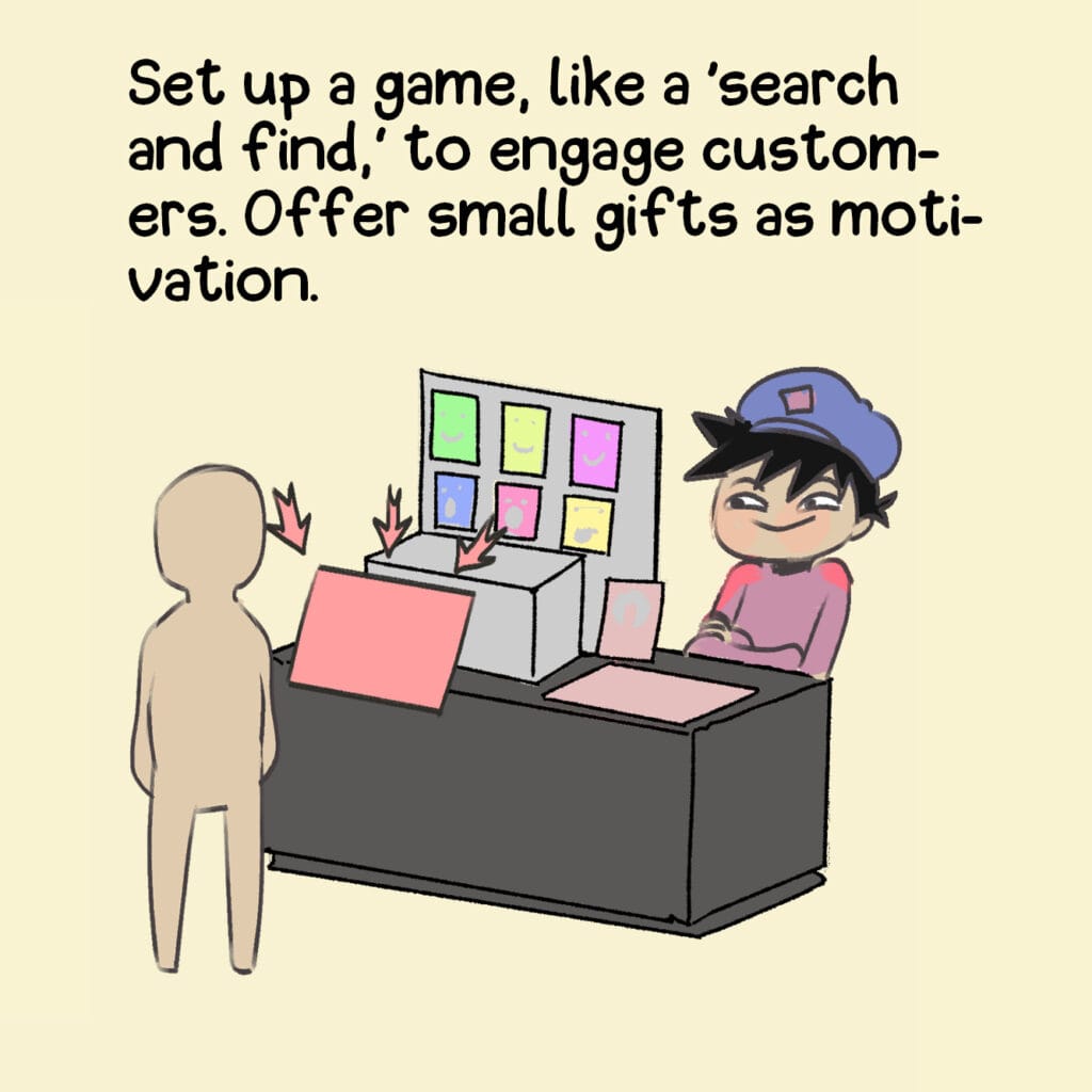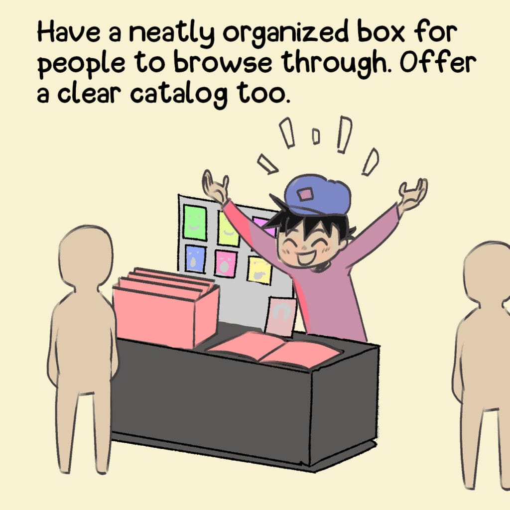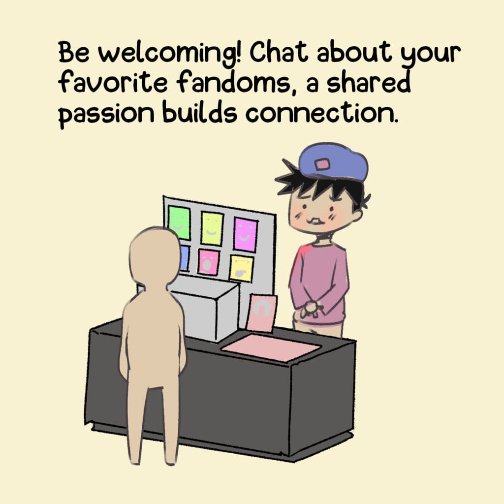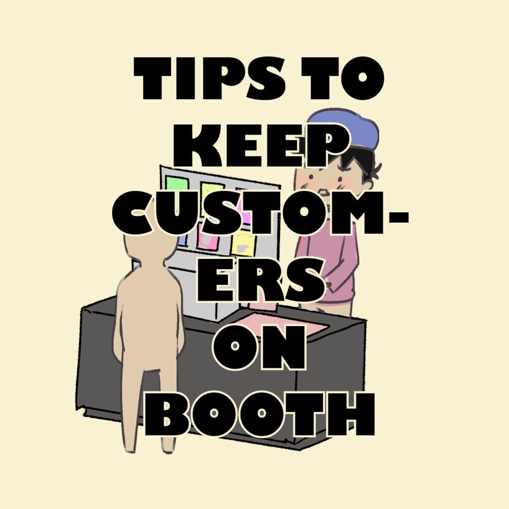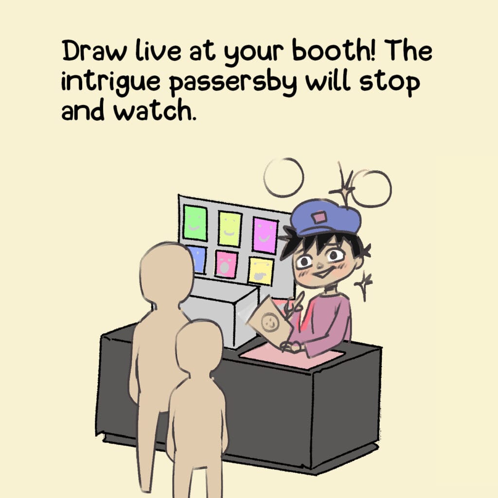 A tongue-in-cheek look at how artists try (and fail) to keep people at their booth. From free stickers to forced smiles, nothing’s too desperate.