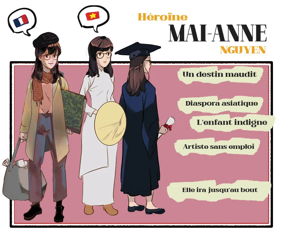 Mai-Anne est confrontée à la question : “Où est ma place dans ce monde ?” Ni exactement vietnamienne, ni exactement française, pas une artiste comme les autres. Au delà des clichés qui ont fait d’elle une bonne asiatique intégrée à la société, ce dont elle rêve et ce en quoi elle croit est très différent à l’intérieur. Ce combat intérieur la pousse à trouver un chemin qui a du sens pour elle.